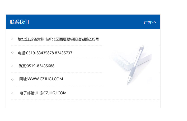 傳真:0519-83435688    郵編:213135    網址:WWW.czjhgj_com.kwepwh.com    電子郵箱:JH@czjhgj_com.kwepwh.com